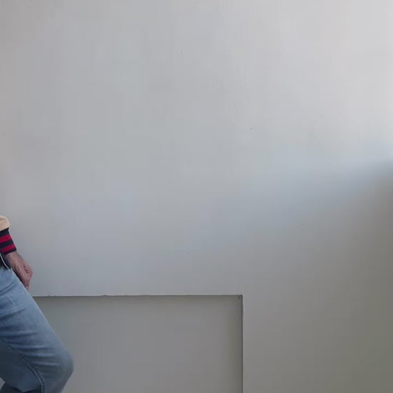 - Color: Combination of off white, navy blue and red color