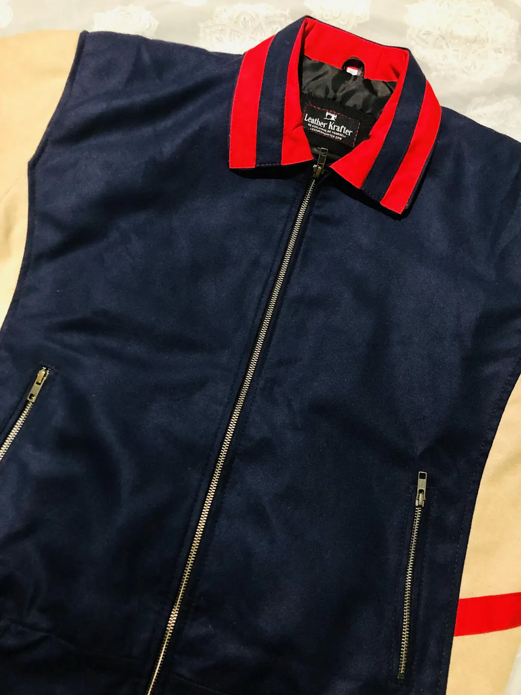 Crafted from premium wool blend fabric with soft viscose lining, this jacket ensures lasting warmth and comfort without compromising on breathability. The navy blue body contrasts perfectly with the camel tan sleeves, finished with a bold red-striped collar, cuffs, and hem recreating the true varsity aesthetic that defined the 1980s. The front zip closure and functional side pockets make it both stylish and practical for daily wear.